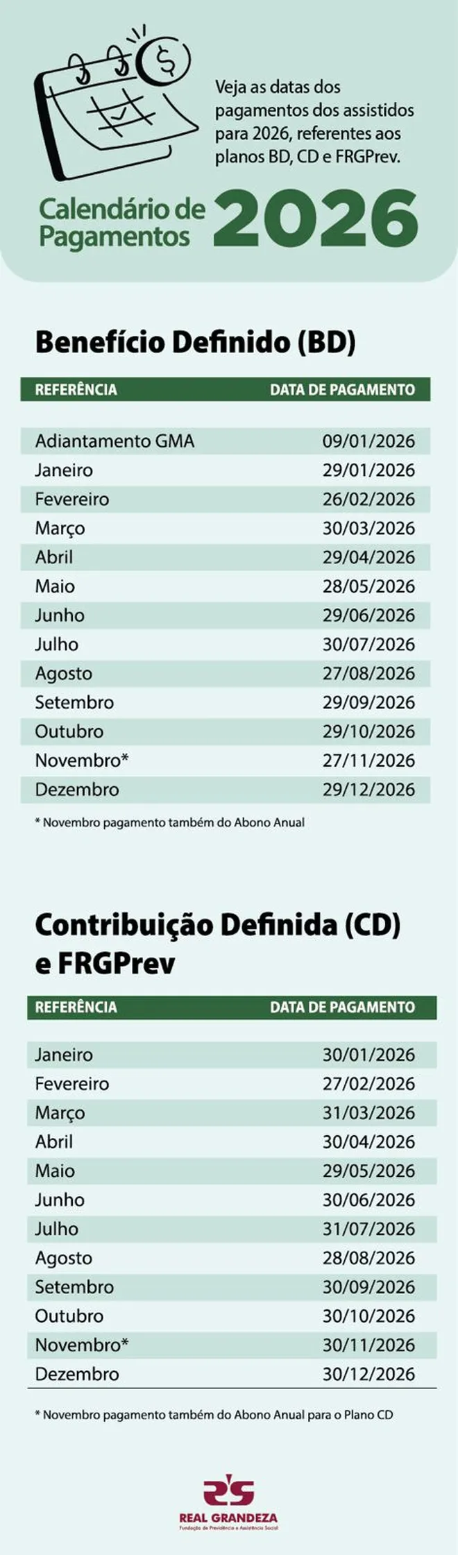 Confira abaixo as datas de pagamento dos assistidos dos planos de Benefício Definido (BD), Contribuição Definida(CD) e FRGPrev para o ano de 2026.