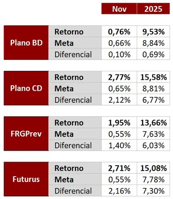 O grande destaque do mês de novembro foi o Plano CD, que obteve rentabilidade de 2,8%, ultrapassando, com folga, a meta de 0,6%, no período. No acumulado do ano, as notícias são ainda mais positivas: os planos CD, Futurus e FRGPrev ultrapassaram os seus objetivos por uma margem superior a 6% (veja a tabela abaixo).