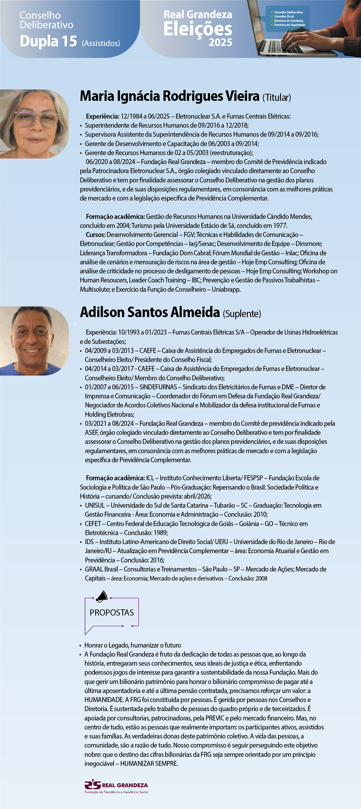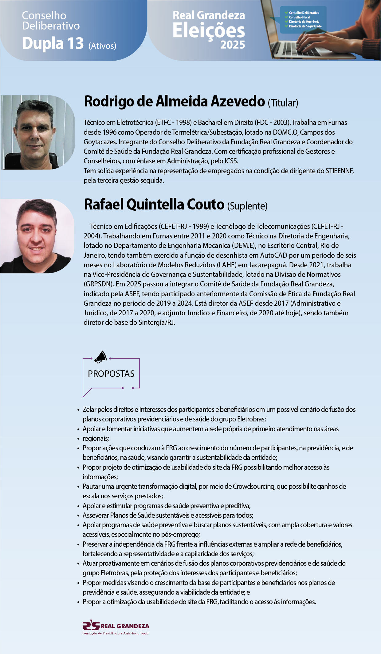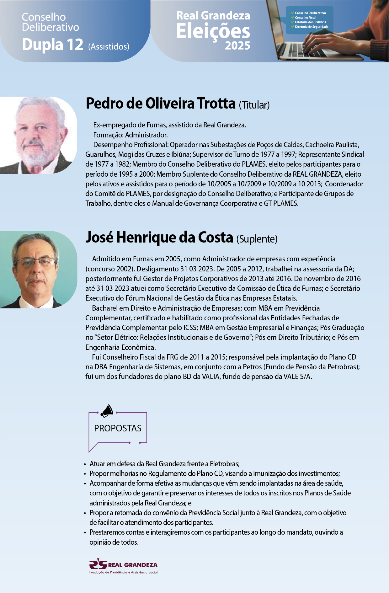 A Real Grandeza divulga os currículos/propostas dos candidatos e das duplas que concorrem as vagas no Conselho Deliberativo, suplente no Conselho Fiscal, Diretoria de Seguridade e Diretoria de Ouvidoria.