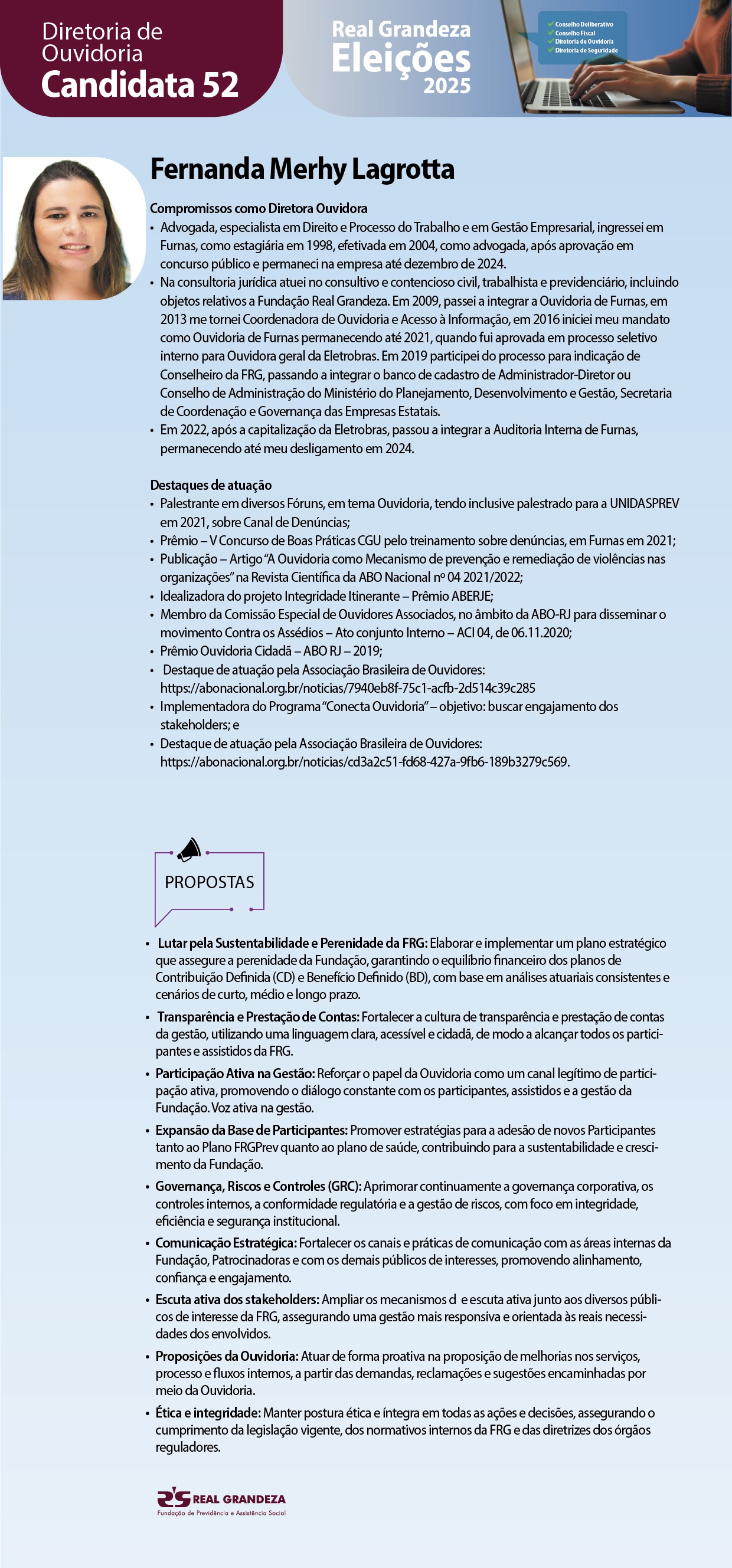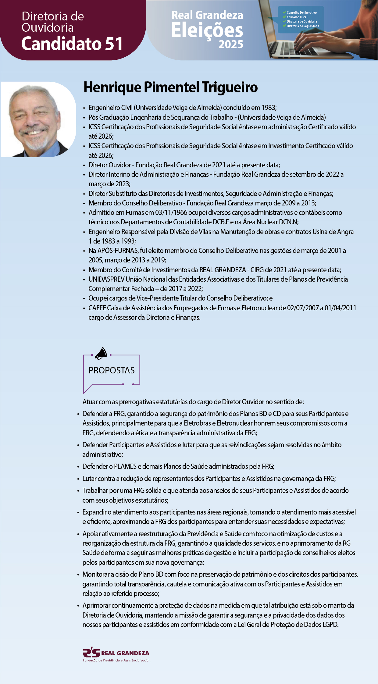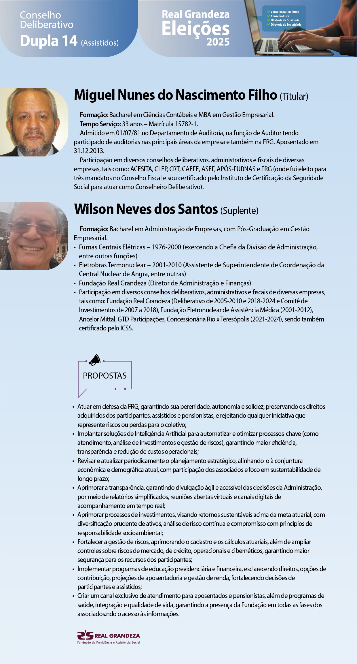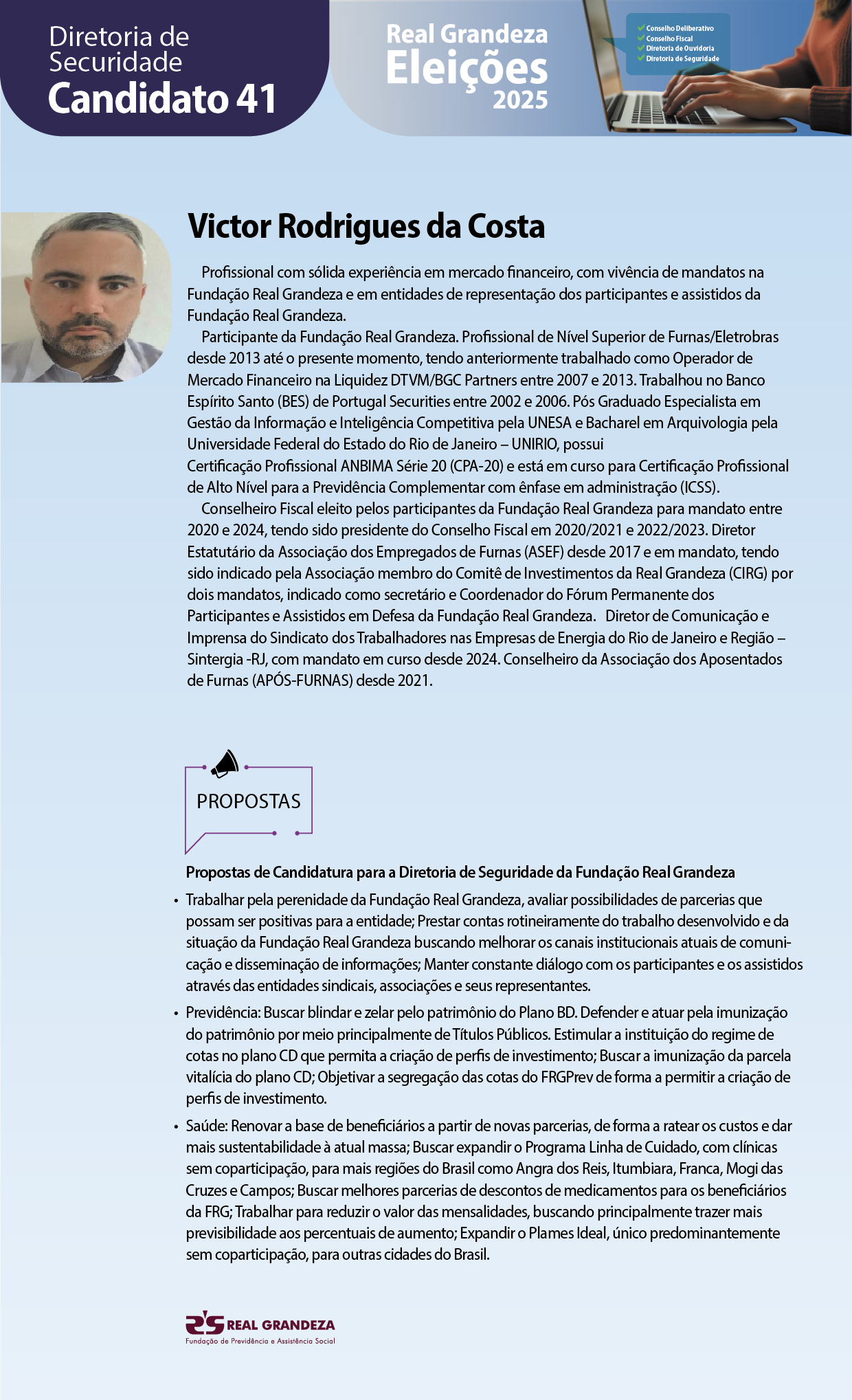 A Real Grandeza divulga os currículos/propostas dos candidatos e das duplas que concorrem as vagas no Conselho Deliberativo, suplente no Conselho Fiscal, Diretoria de Seguridade e Diretoria de Ouvidoria.