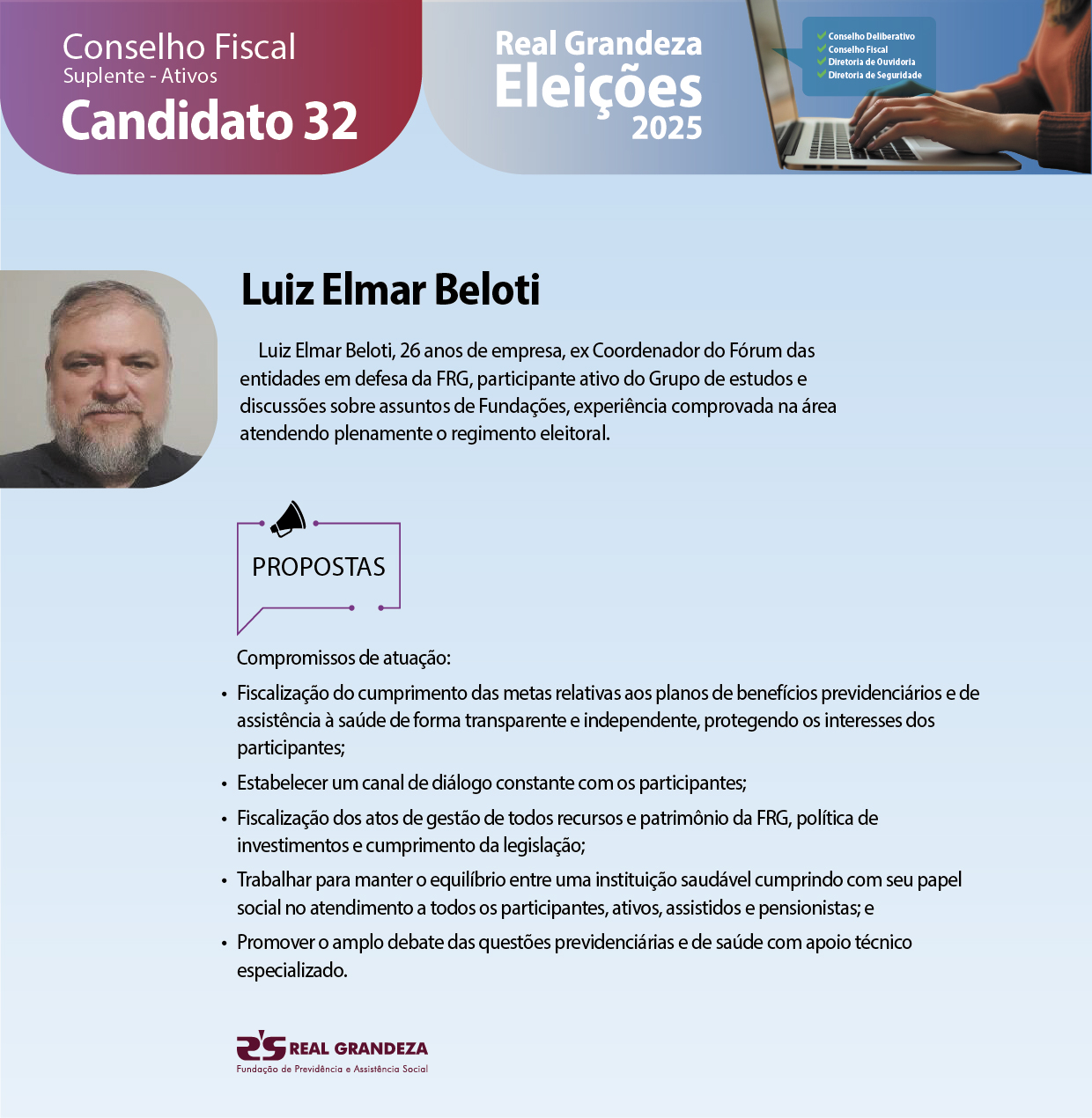 A Real Grandeza divulga as candidaturas homologadas para o processo eleitoral que vai eleger três membros titulares, e respectivos(as) suplentes, para o Conselho Deliberativo, um(a) Diretor(a) de Seguridade e um(a) Diretor(a)-Ouvidor(a), todos para um mandato de quatro anos, e dois membros suplentes para o Conselho Fiscal, para completar o mandato em curso, ou seja, até 30/03/2028.