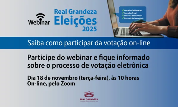 No dia 18 de novembro, às 10h, será realizado um webinar on-line, via Zoom, para apresentar o sistema de votação digital e os procedimentos que serão adotados no processo eleitoral da Real Grandeza.