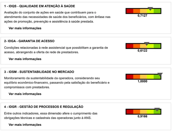 O Índice de Desempenho da Saúde Suplementar (IDSS) avalia, anualmente e de forma compulsória, todas as operadoras atuantes no mercado de saúde suplementar por meio de 33 indicadores, classificados em quatro dimensões, que englobam todo o escopo da operação de uma operadora de plano de saúde, além de um indicador bônus, para operadoras com certificado de acreditação, que pode incidir na nota final da operadora.